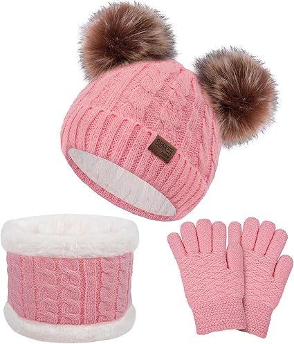 Kids Winter Hat Gloves Scarf Set Toddler Knit Beanie Hat with Pom Pom Neck Warmer Mittens Set for Girls Boys 1-10 Years