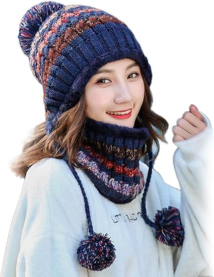 Women Winter Beanie Hat Circle Scarf Set Pompoms Peruvian Ski Snow Ear Flaps Sherpa Knit Hats Fleece Lined, S to M Size Head