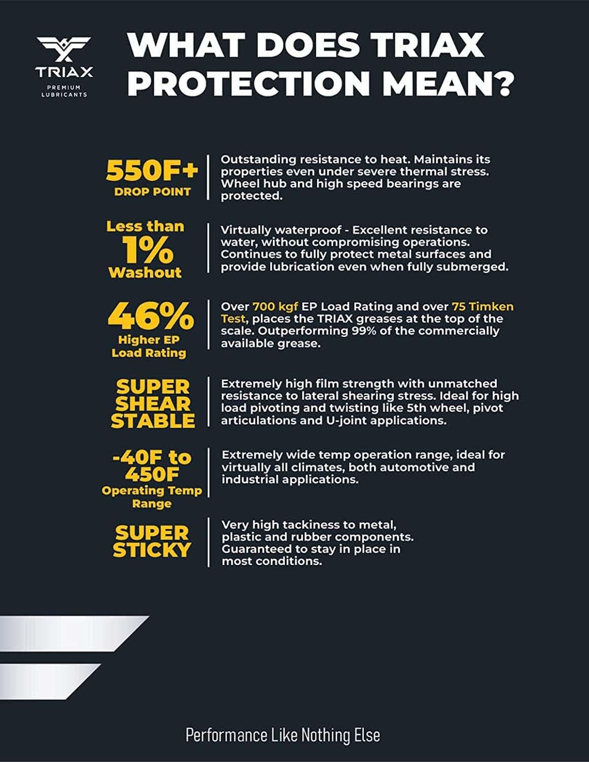 • UNMATCHED THERMAL STABILITY – with a 550 F+ drop point and high operational temperature, Triax Spheron grease will not liquify in high temp applications, such as disk brakes wheel hub bearings where breaking temperature can result in grease breakdown. ZERO SEPARATION under high thermal stress. HIGH OPERATING TEMP -30 F to 450 F.