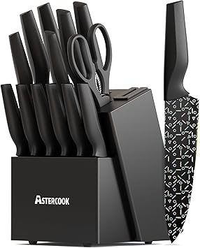 Astercook Knife Set, 15 Pieces Kitchen knives Set with Built-in Sharpener, High Carbon German Stainless Steel Knife Block Sets, Dishwasher Safe, Black