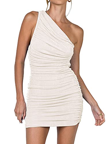 LYANER Women's Sexy One Shoulder Ruched Sleeveless Bodycon Mini Short Dress Beige Small