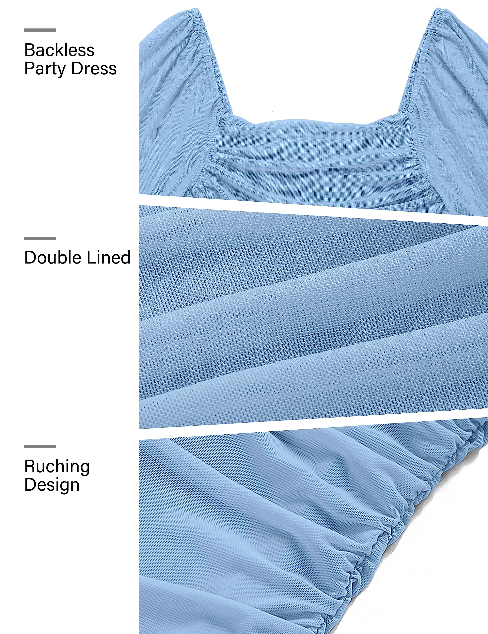 • Feature: Mesh long lantern sleeves, square neck, back hidden zipper, solid color, with elastic band on shoulder/cuffs, fashion mesh material and double lined for not see-through, stretchy, ruched design on the front and back.
