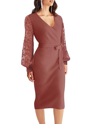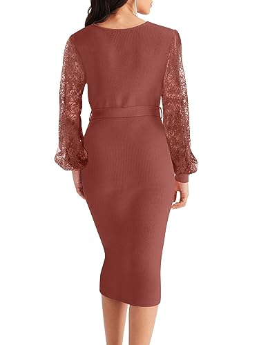 MEROKEETY Sweater Dress for Women 2024 Bishop Sleeve V Neck Semi Formal Business Work Pencil Dresses, Brickred, Small