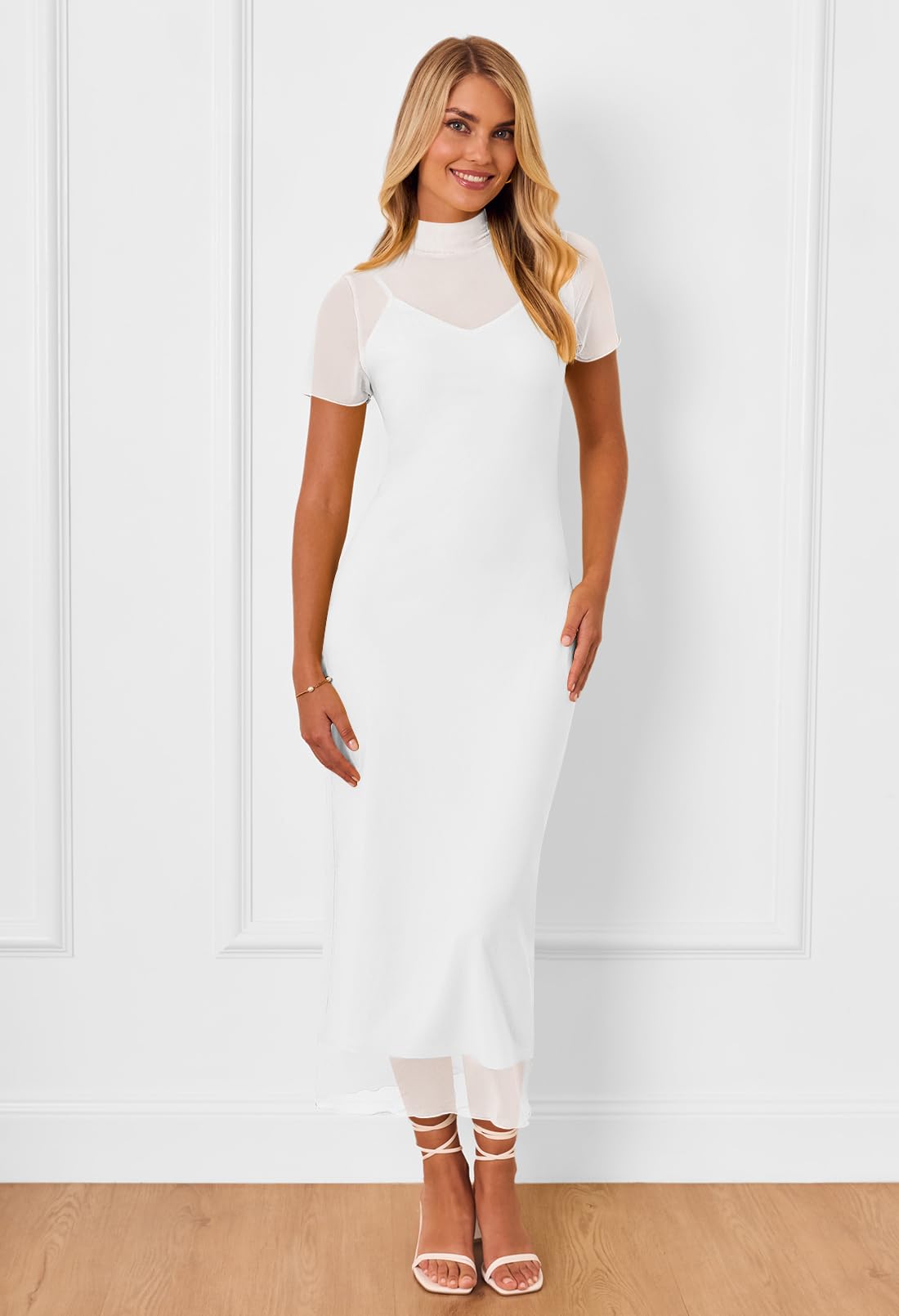 MEROKEETY Women's 2024 Summer Bodycon Mock Neck Dresses Sheer Mesh Slip Sexy Party Cocktail Maxi Dress, White, L