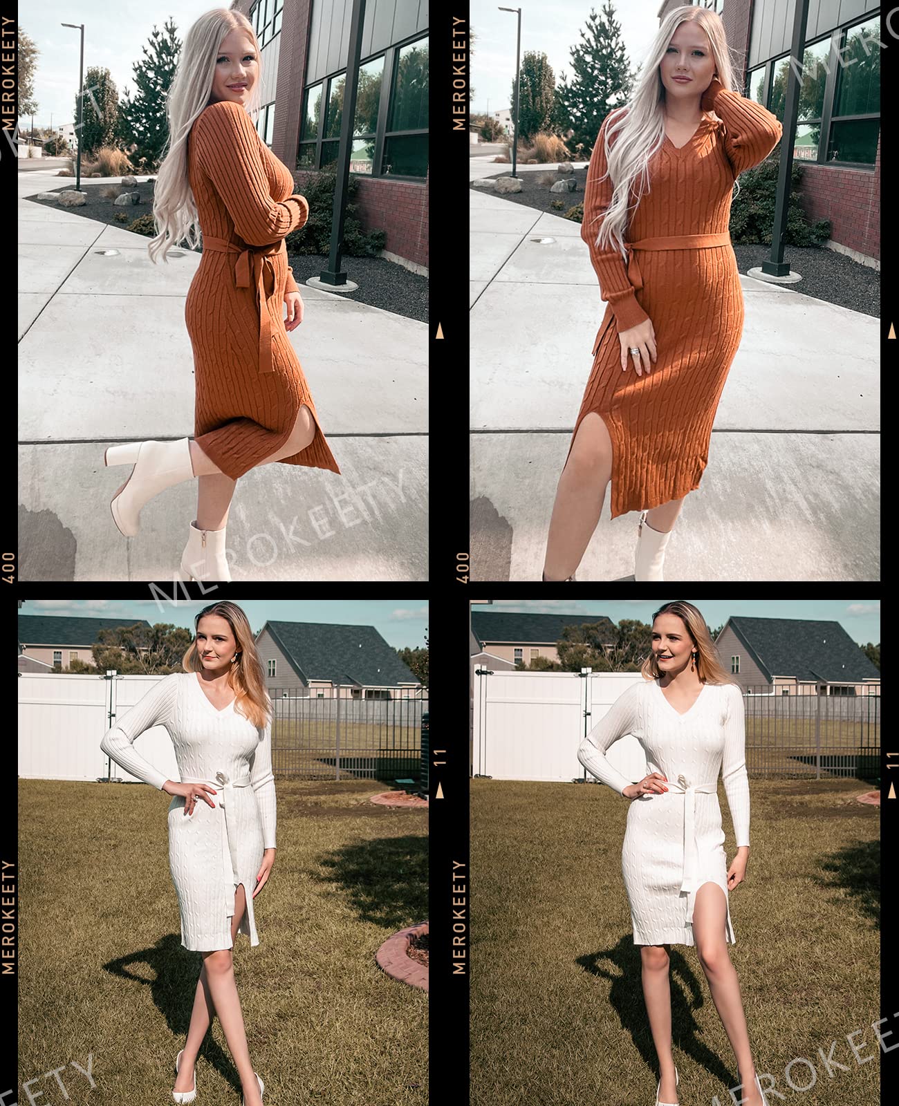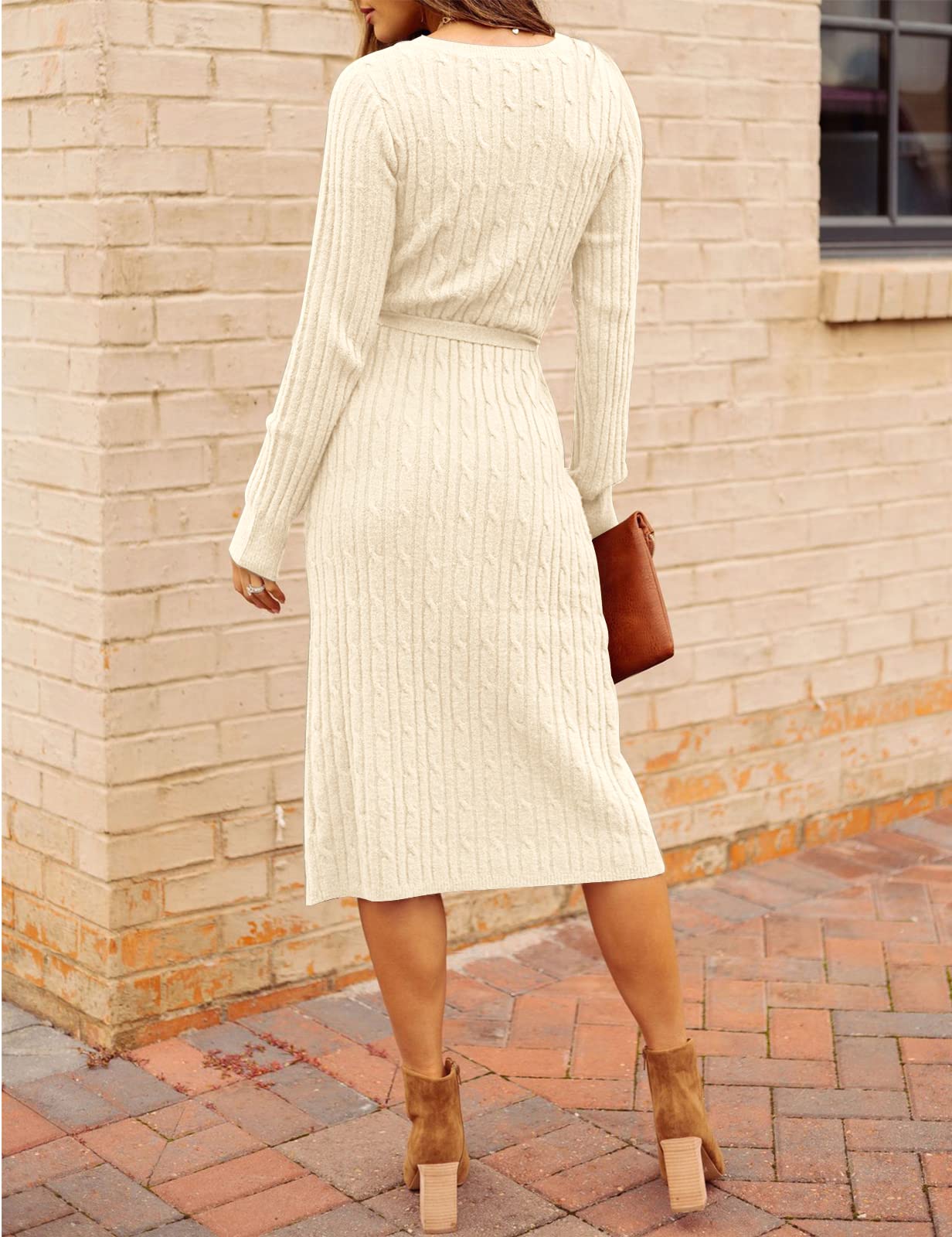 • Feature: twist cable knit texture, classic solid color, side slits, bodycon and slim fit, tie waist with a belt, sexy v neck, ribbed long sleeves, stretchy sweater dress, elegant midi knitted dress.