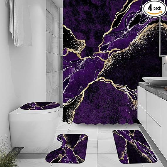 4 Pcs Purple Marble Shower Curtain Sets, Gold Cracked Lines Black Bathroom Decor, Rug Toilet Lid Cover and Non-Slip U Shape Mat, Abstract Modern Luxury Waterproof Shower Curtain with 12 Hooks, 72 x 72