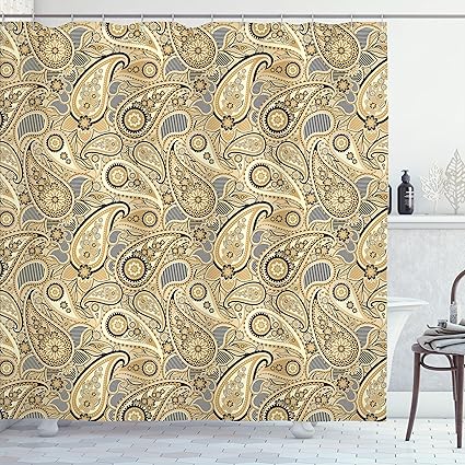 Ambesonne Earth Tones Shower Curtain, Exotic Middle Eastern Pattern Traditional Paisley Welsh Pears Illustration, Cloth Fabric Bathroom Decor Set with Hooks, 69" W x 75" L, Grey and Yellow