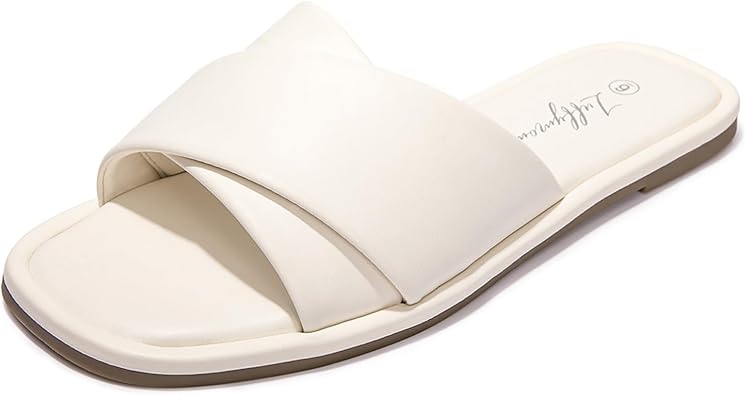 Luffymomo Womens Square Toe Flat Sandals Soft Leather Slide Sandals Cute Slip on Slippers for Summer
