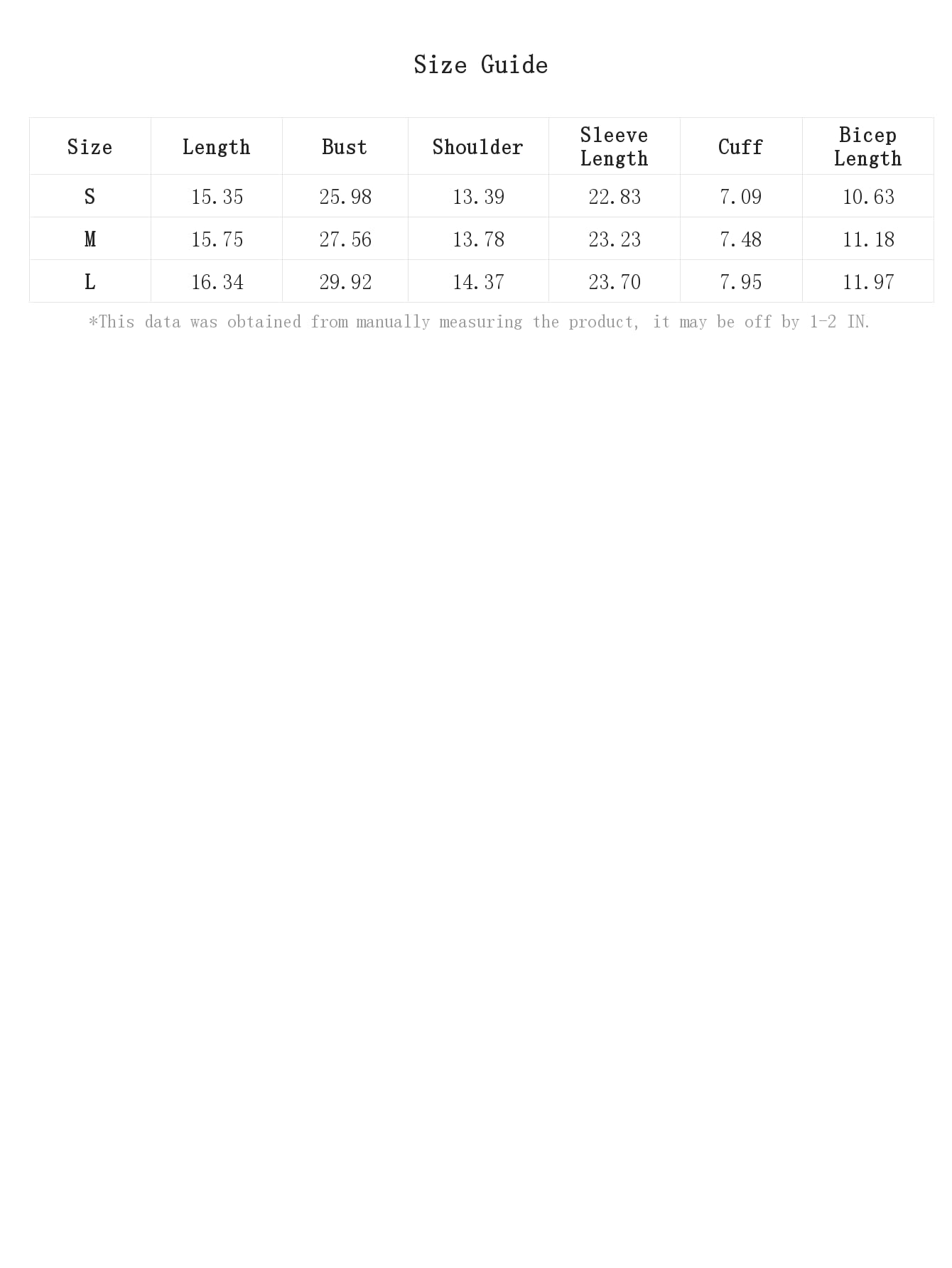 S:Bicep Length:10.6IN,Bust:26.0IN,Cuff:7.1IN,Length:15.4IN,Shoulder:13.4IN,Sleeve Length:22.8IN