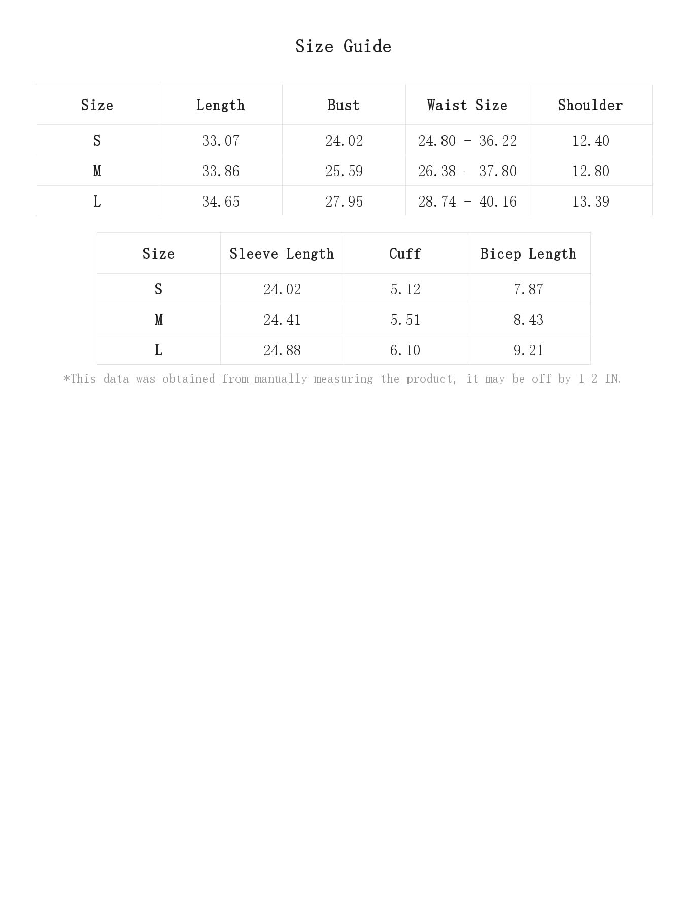 S:Bicep Length:7.9IN,Bust:24.0IN,Cuff:5.1IN,Length:33.1IN,Shoulder:12.4IN,Sleeve Length:24.0IN,Waist Size:24.8-36.2IN
