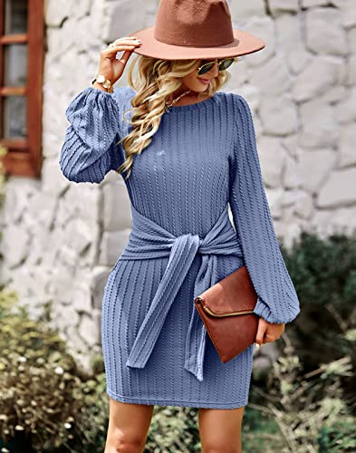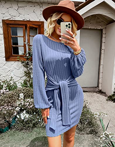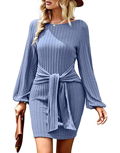 Upopby Long Sleeves Elegant Knitted Bodycon Dress for Women Autumn Winter Tie Waist Knee Length Sweater Pencil Dress Blue L