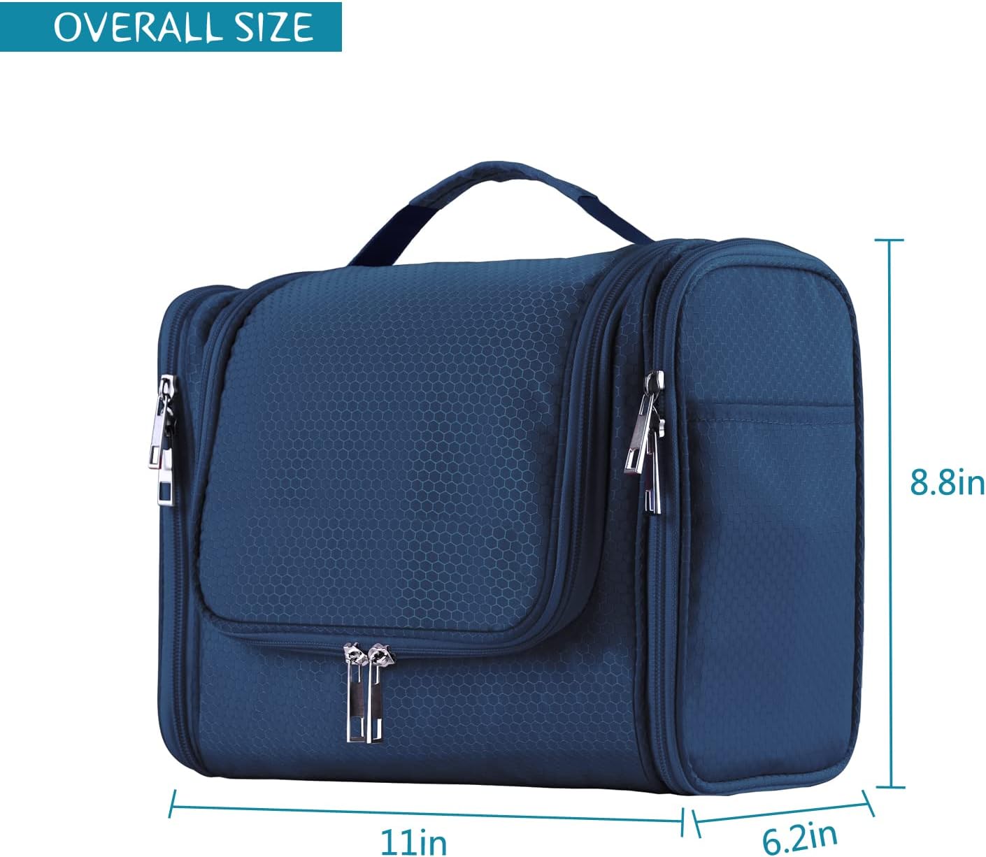 • Large Capacity and Ultra-Durable Zippers : Large travel hanging toiletry bag size: 11"x 6.2" x 8.8", has ample space for long-days trips or family vacation toiletries as shampoo, shower gel, toothpaste, toothbrushes, makeups, shaving accessories, towels, etc, make storage easier, convenient and organized.Our travel bags feature rigorously tested ultra-durable zippers, ensuring your belongings stay safe and sound.