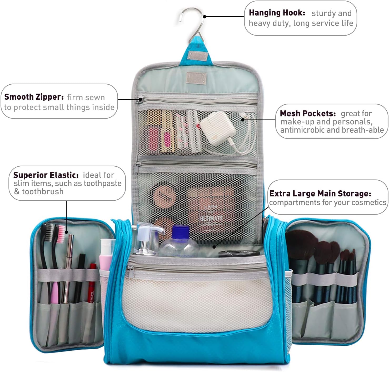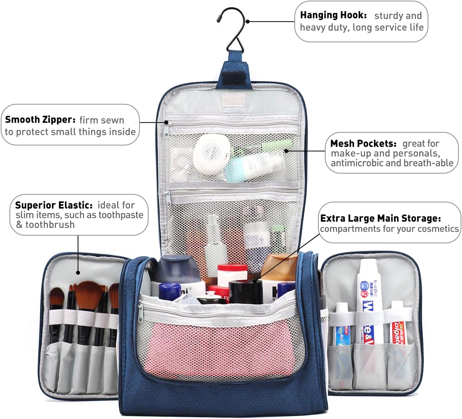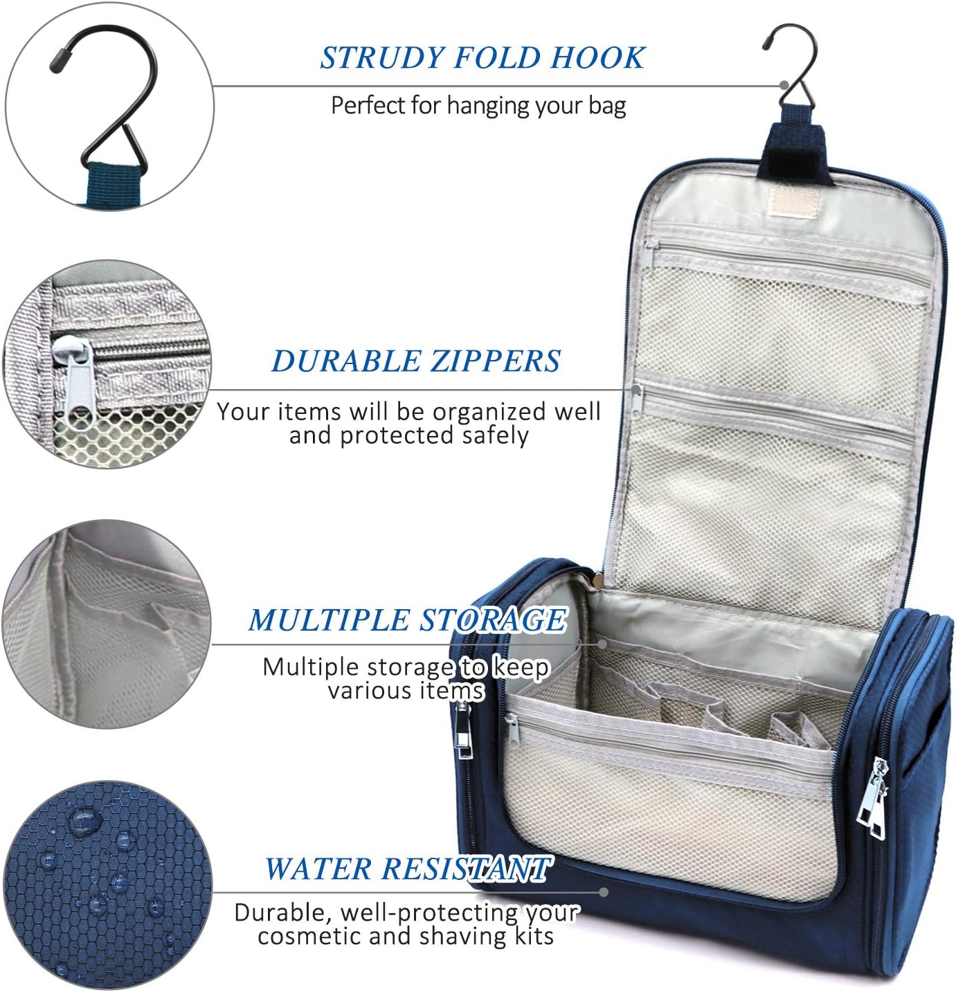 • Multiple Compartments and Sturdy Hook: Multiple upright mesh compartments with zipper closure inside for small item or kits storage, sorting out items at a glance, attached sturdy metal hanging hook lets you hang this toiletry bag on the bathroom door, shower rod or towel rack for fast access to your toiletries and excellent design & colors of this toiletry storage bag makes your travel ease and enjoyable.