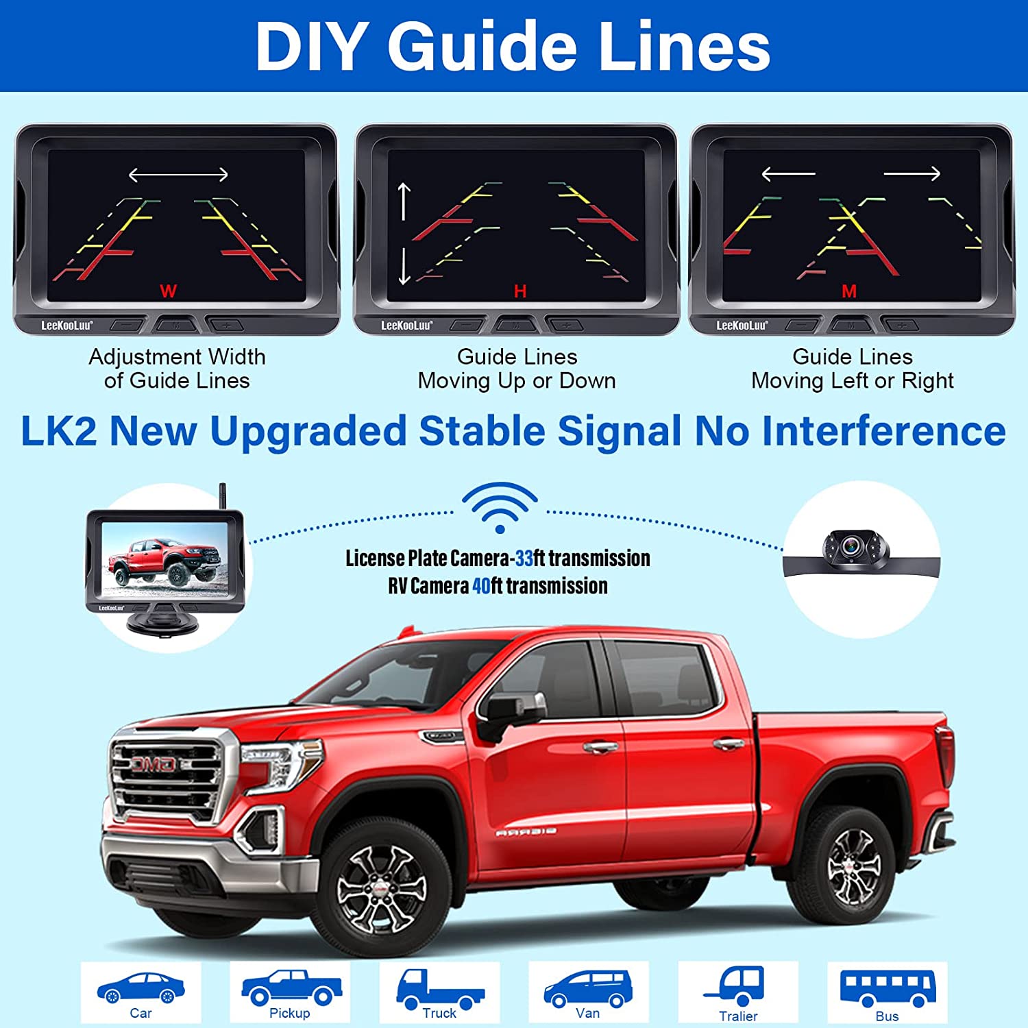 LeeKooLuu Wireless Backup Camera 5 Inch Rear View Monitor Kit HD 1080P Bluetooth Reverse Cameras for Truck Car Van Camper Two Channels Waterproof Night Vision DIY Parking Guide Lines LK2