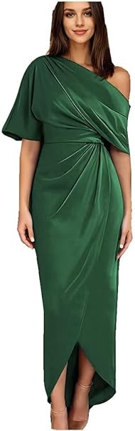 Raseal Women's One Shoulder Satin Mother of The Bride Dress with Sleeves Tea Length Fromal Evening Dress with Slit RS088