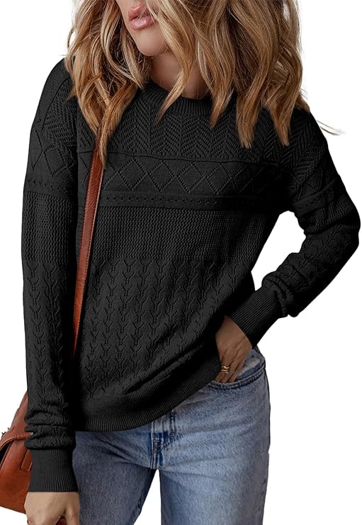 SHEWIN Sweaters for Women Casual Crew Neck Long Sleeve Crochet Pullover Tops Sweater