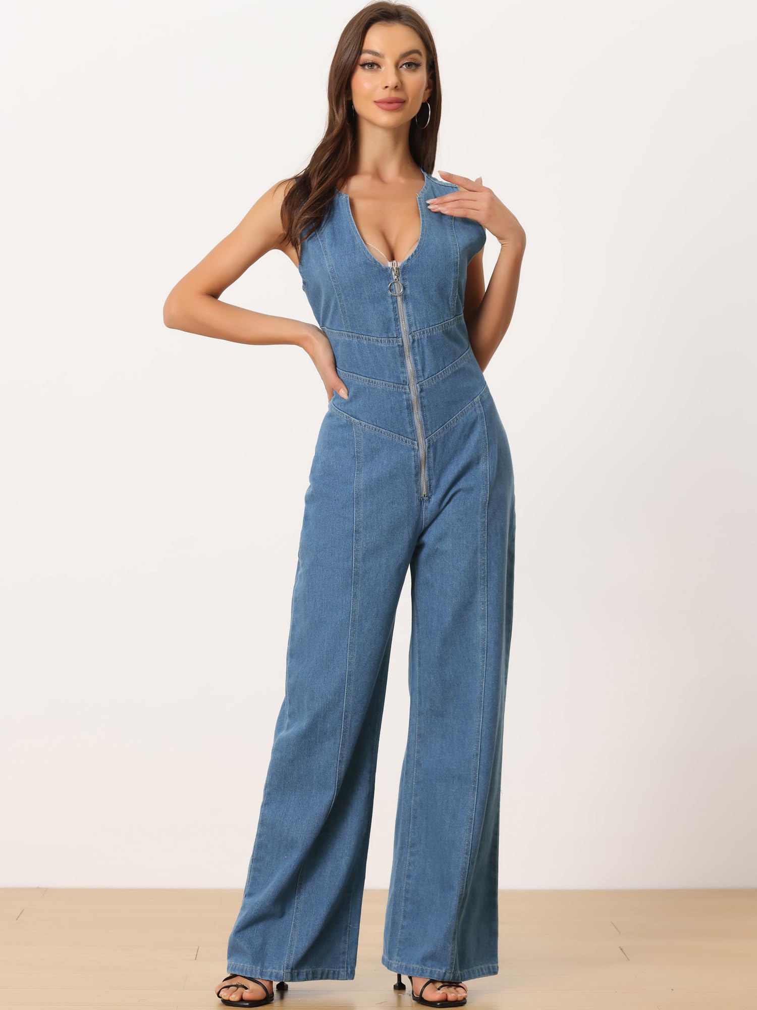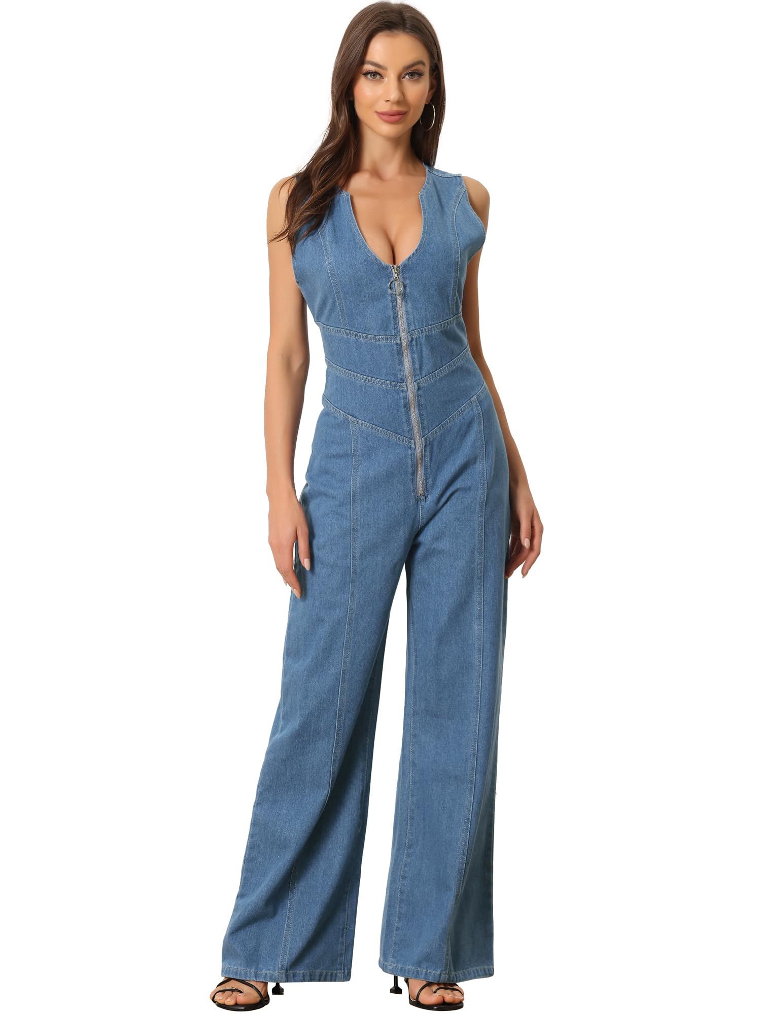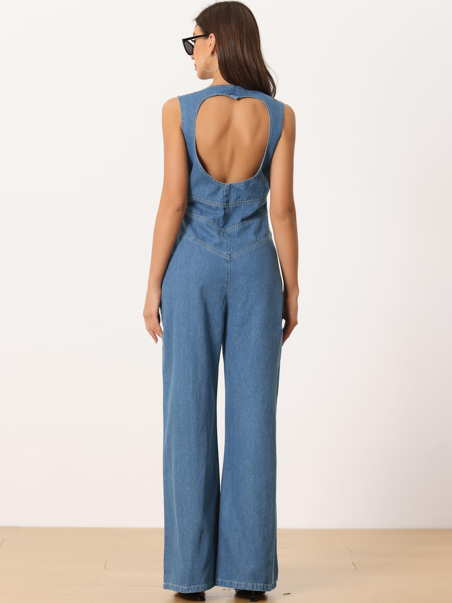 Allegra K Women's Jean Jumpsuit V Neck Zip Up Backless Cut Out Denim Jumpsuit X-Small Blue