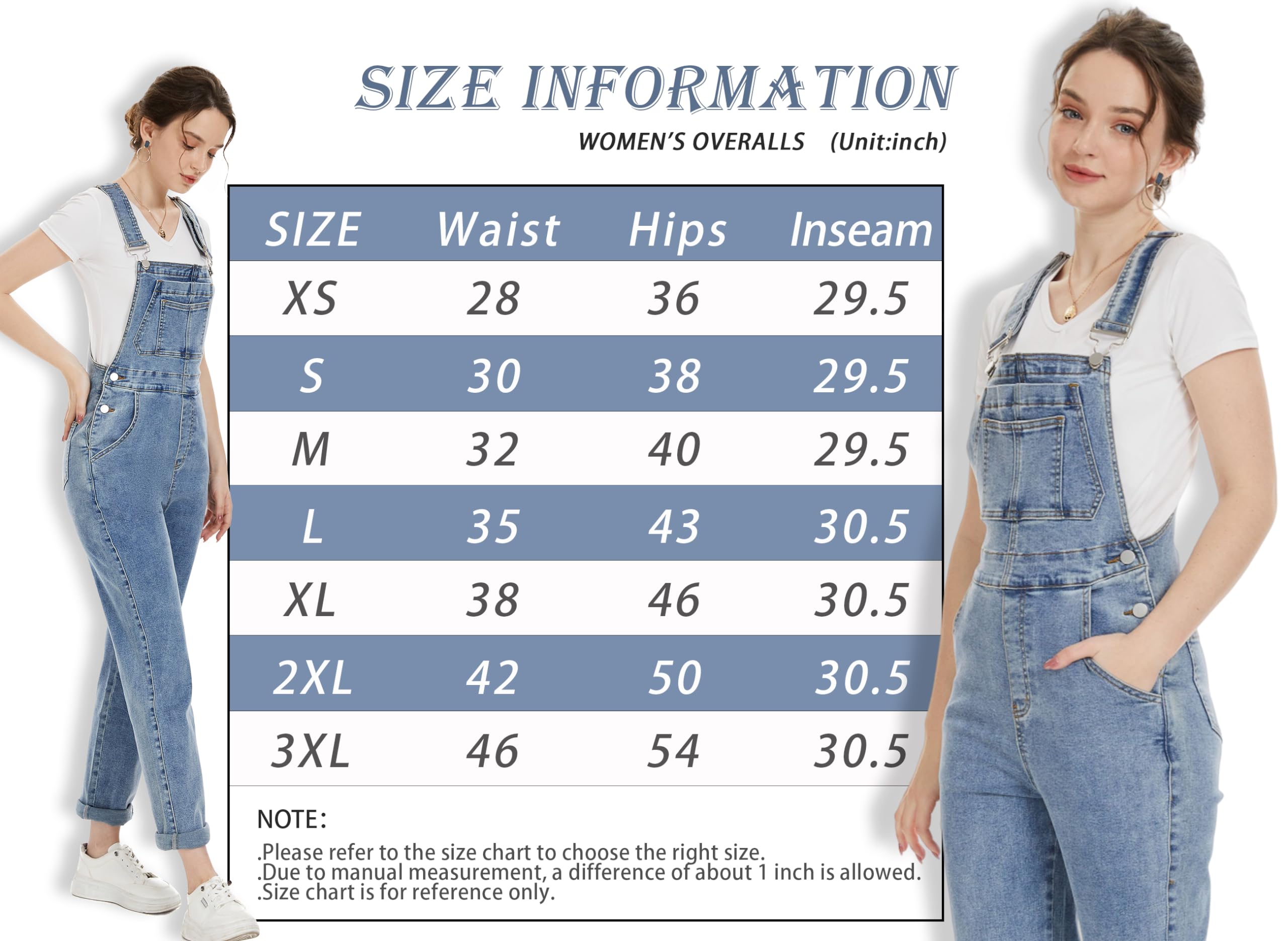 • 【Jean Jumpsuit Size】Womens bib overalls casual are true to US size. Size Small fits size 2 - size4, size Medium fits size6 - size 8, size Large fits size 10 - size 12, size X-Large fits size 14 - size 16, size XX-Large fits size 16 - size 18,size XXX-Large fits size 20. The womens overalls comfy are soft and slightly stretchy. We suggest gentle machine wash or hand wash, do not bleach.