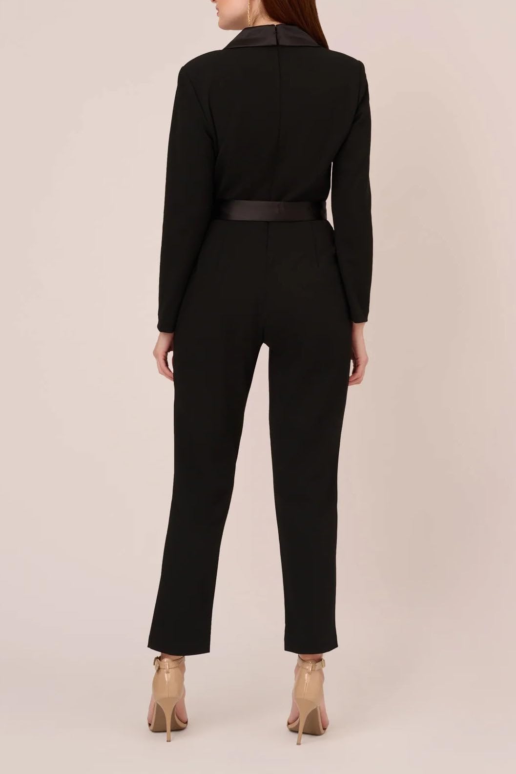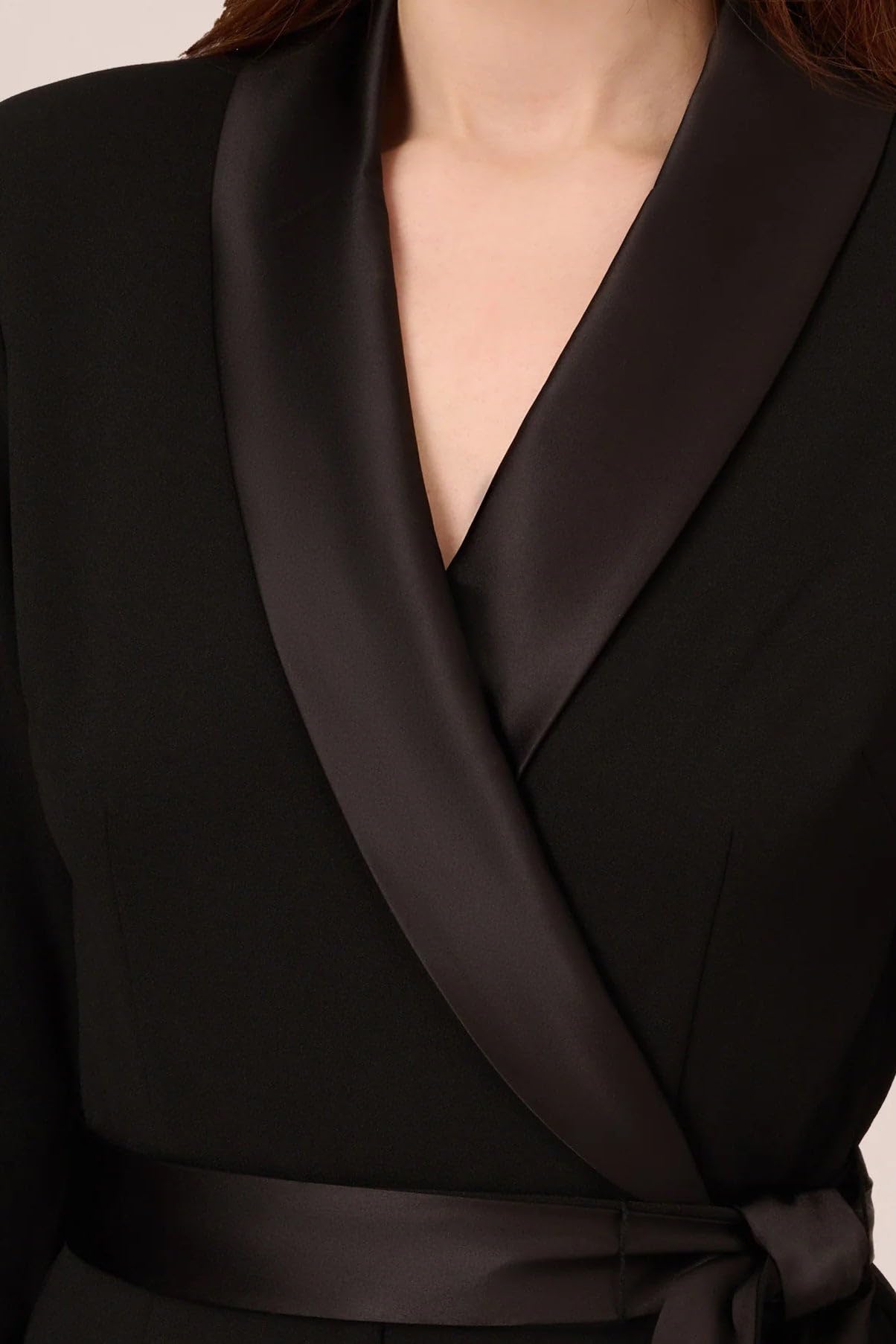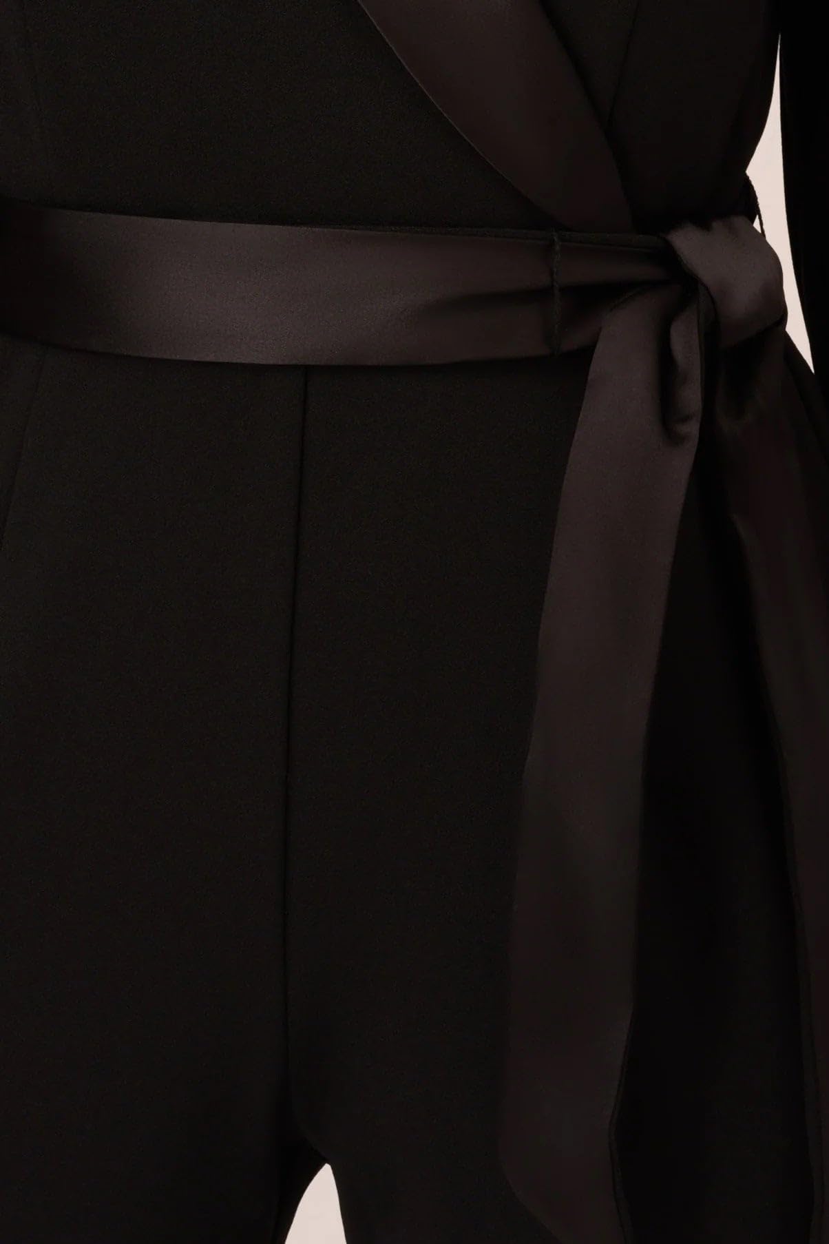 Details: A savvy alternative to the sheath, this tailored jumpsuit will take you effortlessly from day to night. Created in our stretch crepe fabrication this sophisticated all-in-one is cleverly enhanced by a tuxedo-inspired satin collar. While feminine elements, including a tapered leg, faux wrap bodice, and removable waist-cinching sash, ensure a flattering fit. Complement this smart jumpsuit with towering heels and a striking clutch.