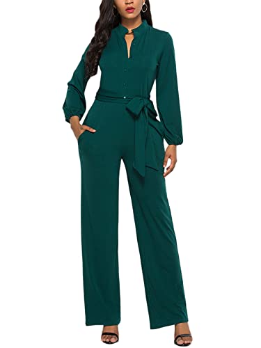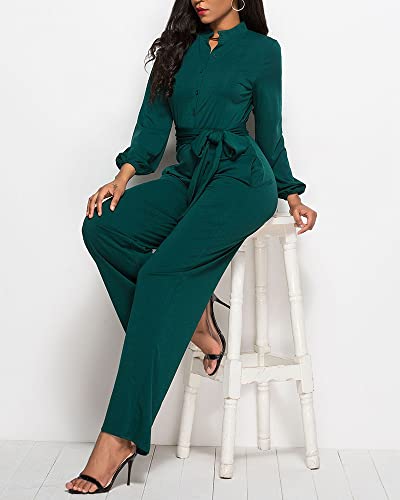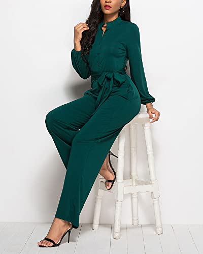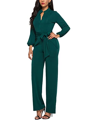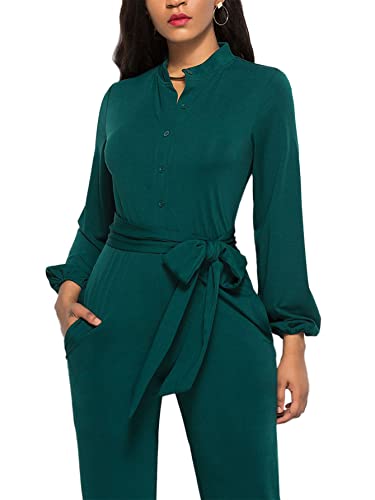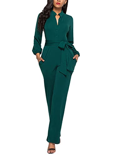 LYANER Women's V Neck Long Sleeve Tie Waist Blazer Jumpsuit Long Romper Dark Green Large