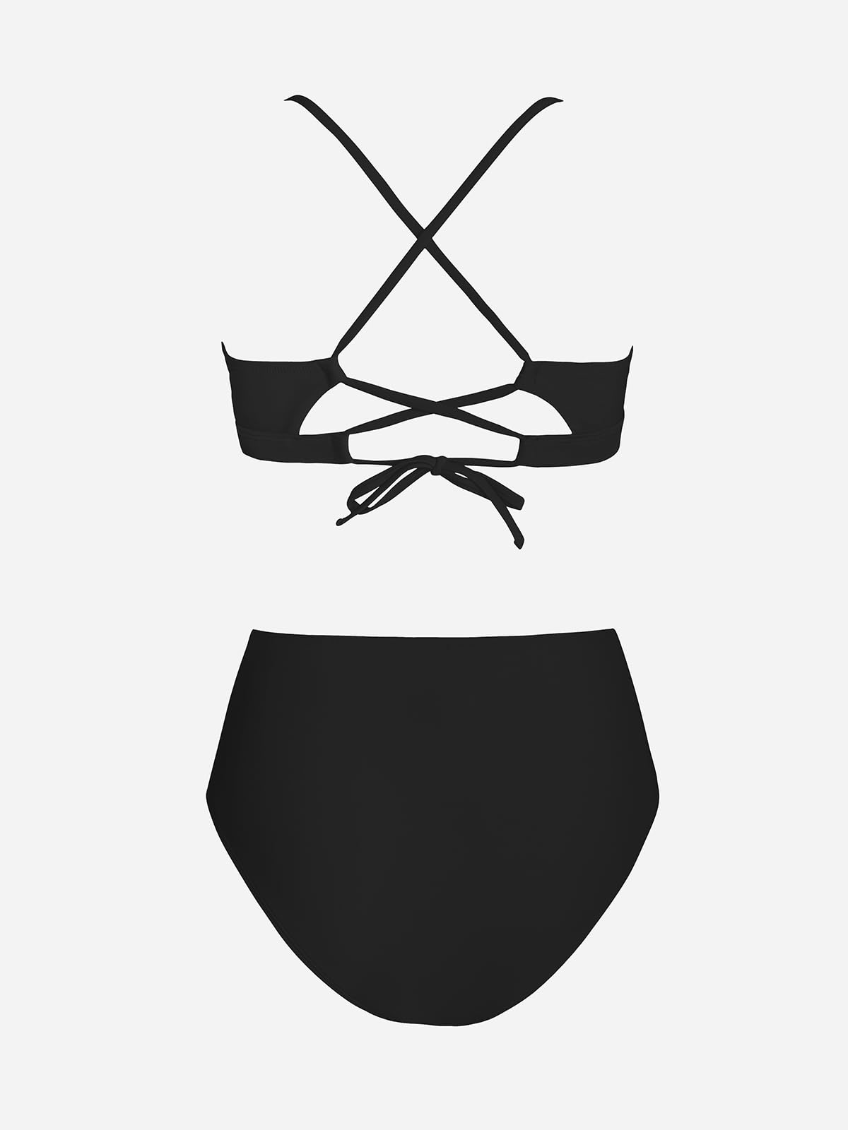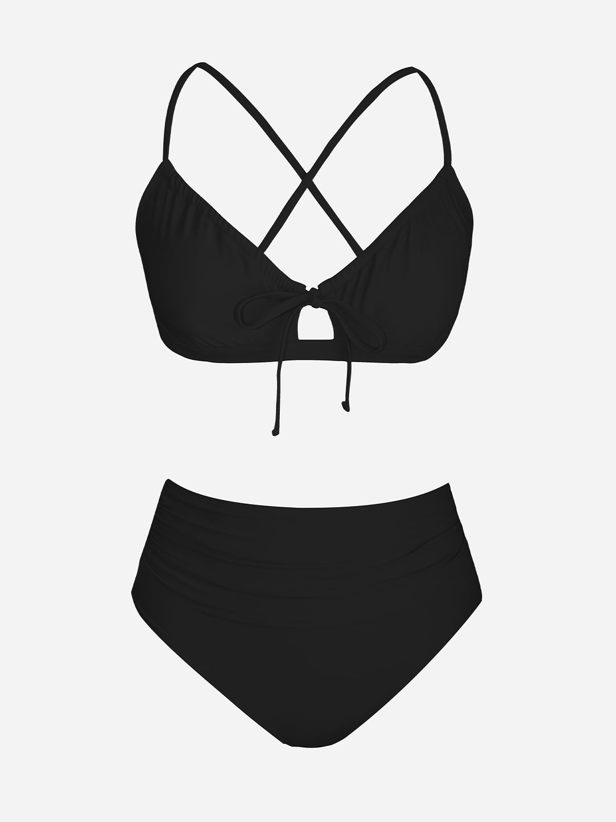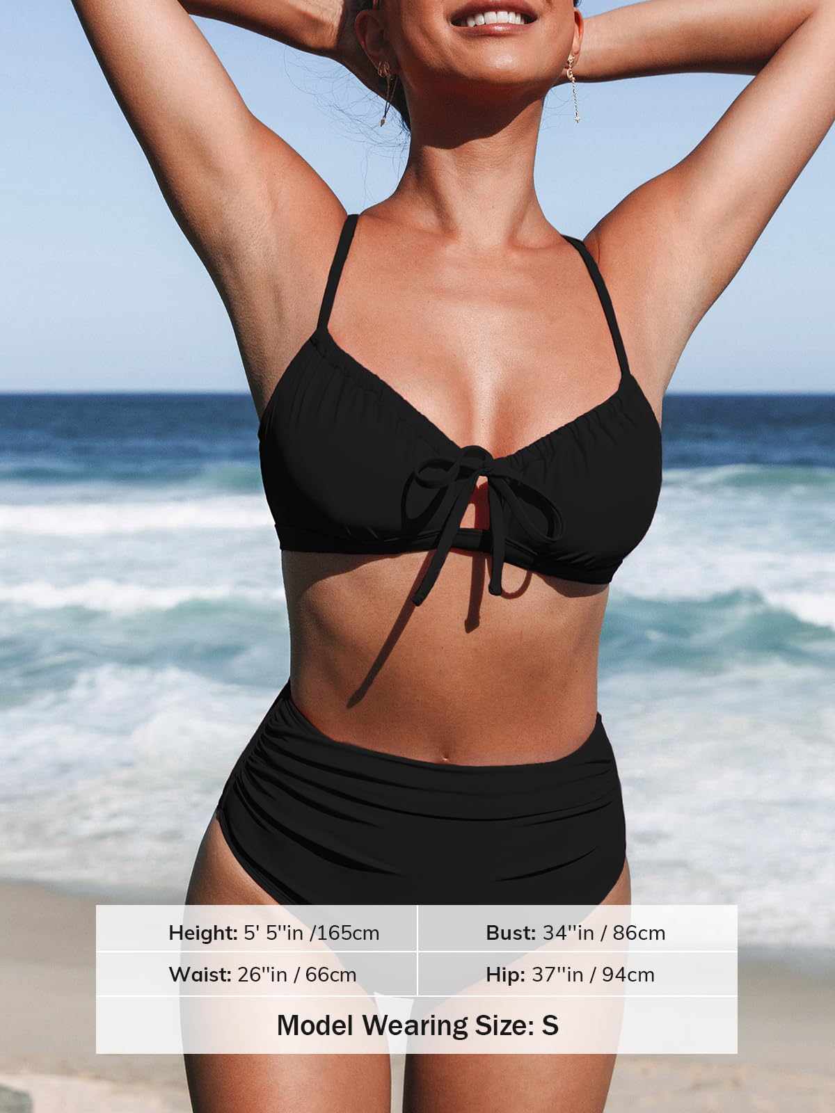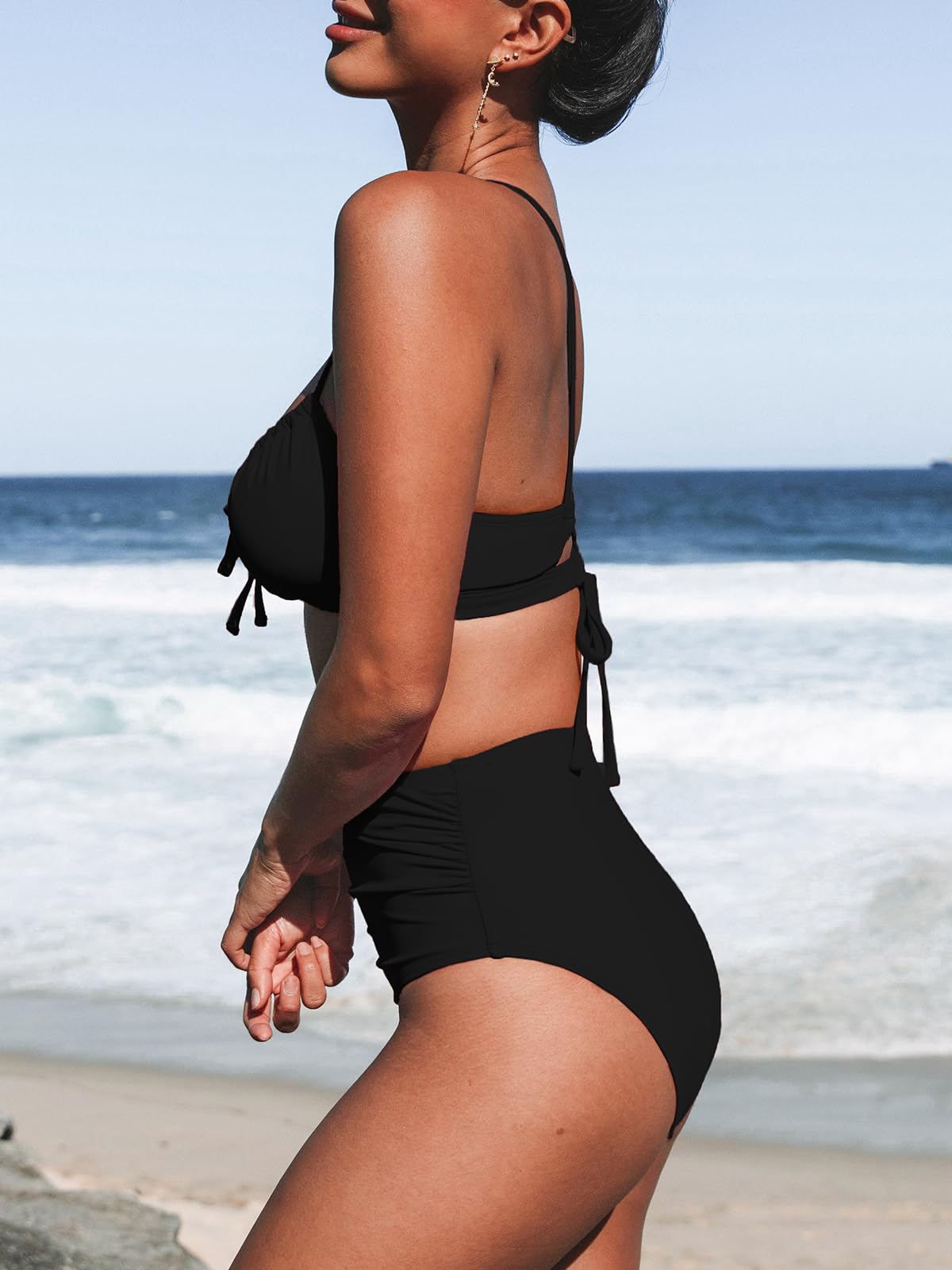 CUPSHE Women's Bikini Sets Two Piece Swimsuits Scoop Neck Crisscross Back Self Tie High Waisted Ruched, M Black