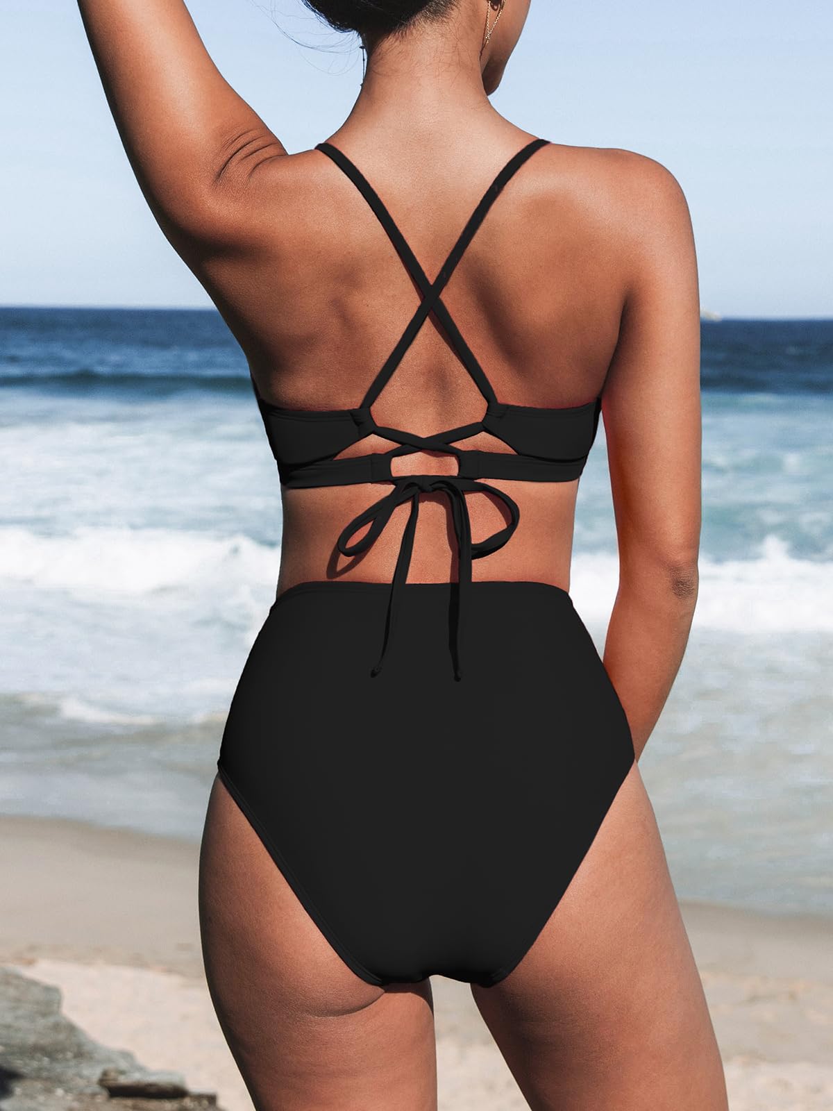 • Design: The Stylish Two Piece Bathing Suit Features Scoop Neck and Crisscross Back Lace Up Designs. Front Cutout and Ruched Details Make The Bikini Top Sexy and Modern. This High Waisted Bottoms Ensemble Offer Tummy Control and Full Bum Coverage.
