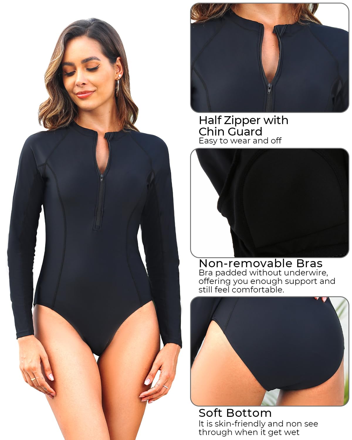 • Zipper one piece rash guard for women: This one piece rashguard is designed with a front zipper, which is easy to put on and take off. The non-removable built-in bra provides you with enough support.
