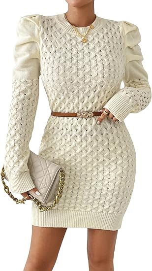 Women's Cute Cable Knit Mini Sweater Dress Fall 2024 Ladies Dressy Casual Chunky Crewneck Puff Long Sleeve Dresses