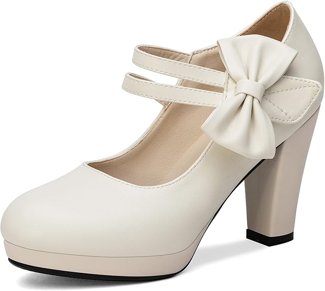 100FIXEO Chic Mary Jane Shoes Women Heels and Pumps Ladies Block High Heel Sweet Ankle Strap Dress Pumps Hook and Loop Bow Heels Closed Toe