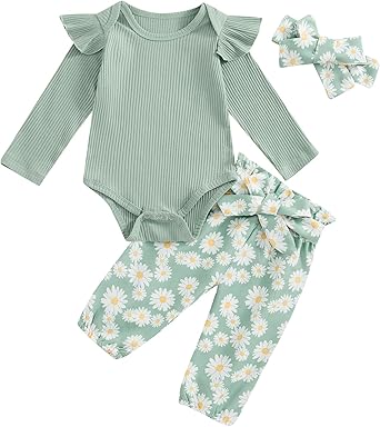 Baby Girl Fall Outfits Long Sleeve Ruffled Ribbed Knit Romper Daisy Print Pants Winter Clothes 3 6 9 12 18 Months