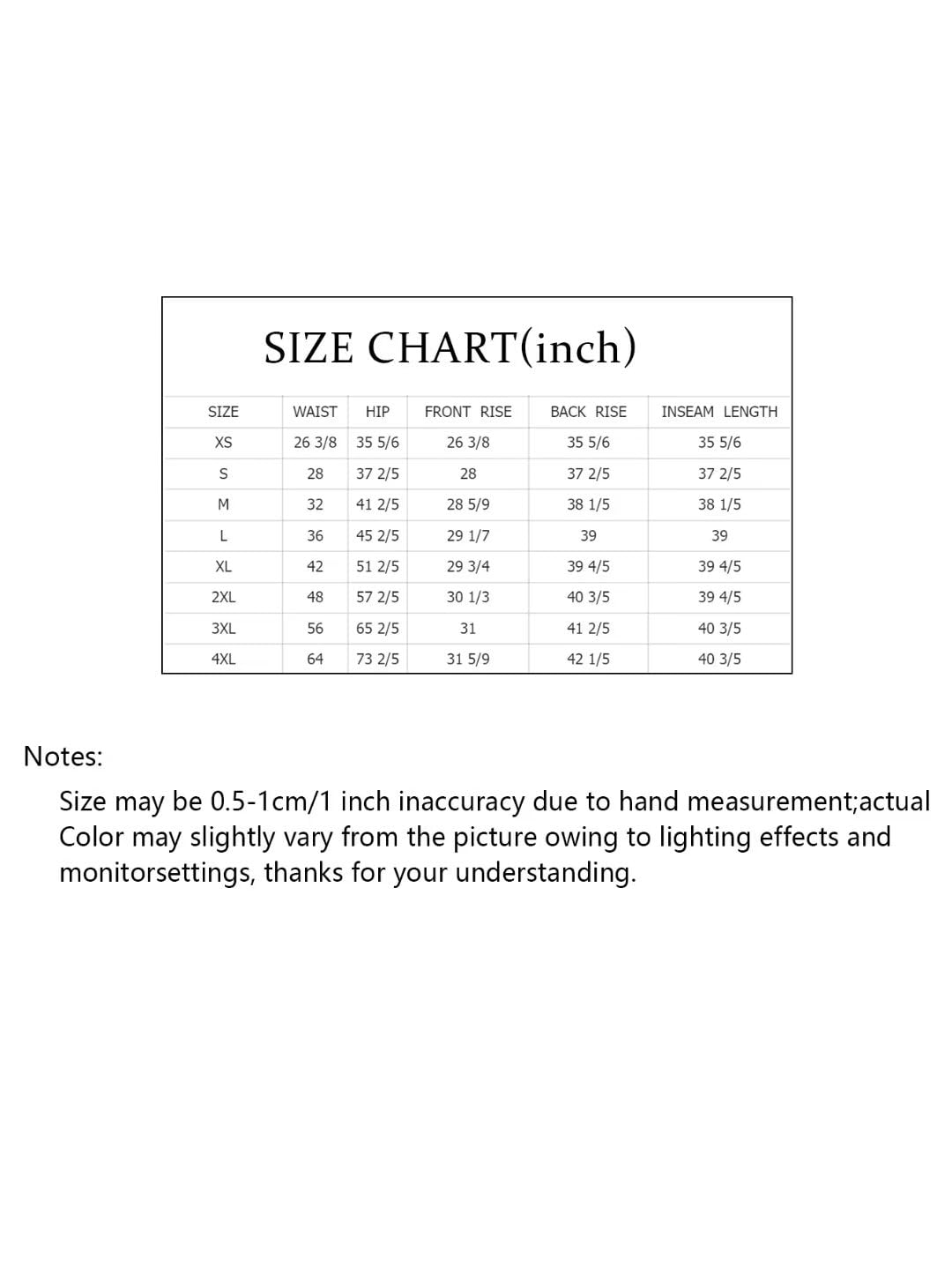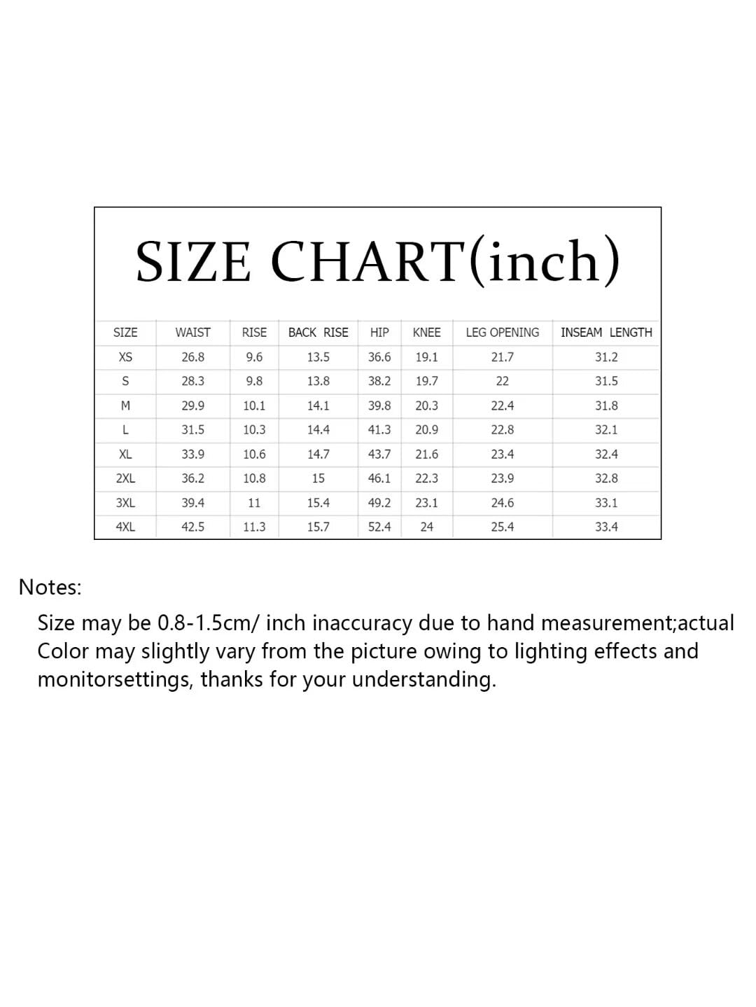 • Size Chart: XS:Waist:26-27",Hip:36-37",Inseam length:31-32". S:Waist:28-29"Hip:38-39",Inseam length:31-32". M:Waist:29-30",Hip:39-40",Inseam length:31-32". L:Waist:31-32",Hip:41-42",Inseam length:32-33". XL:Waist:33-34",Hip:43-44",Inseam length:32-33". 2XL:Waist:36-37",Hip:46-47",Inseam length:32-33". 3XL:Waist:39-40",Hip:49-50",Inseam length:33-34". 4XL:Waist:42-43",Hip:52-53",Inseam length:33-34".