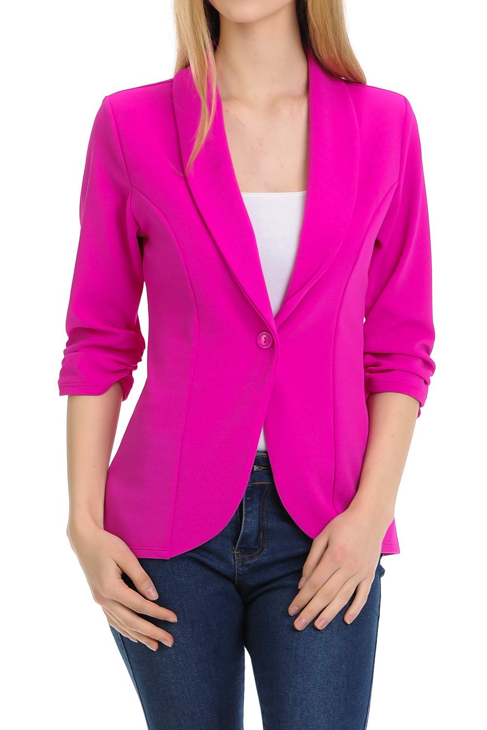Details: MINEFREE Women's Classic 3/4 Ruched Sleeve Open Front with a Single Button Lightweight Work Office Blazer Jacket / S-3XL / Made in USA [Measurements] MJA006: S - Shoulder: 16.0in. / Chest: 32.0in. / Length: 24.5in. / Sleeve length: 15.0in. M - Shoulder: 16.5in. / Chest: 34.0in. / Length: 25.0in. / Sleeve length: 15.5in. L - Shoulder: 17.0in. / Chest: 36.0in. / Length: 25.5in. / Sleeve length: 16.0in. 1XL(PLUS) - Shoulder: 18.0in. / Chest: 40.0in. / Length: 26.5in. / Sleeve length: 17.0in. 2XL(PLUS) - Shoulder: 18.5in. / Chest: 42.0in. / Length: 27.0in. / Sleeve length: 17.5in. 3XL(PLUS) - Shoulder: 20.0in. / Chest: 44.0in. / Length: 27.5in. / Sleeve length: 18.0in. Proudly made in USA. Choose your favorite color in various options. We offer quality items with reasonable price to satisfy customer. MINEFREE is a dedicated brand for women's clothing and ensure high quality merchandise and fine craftmanship.