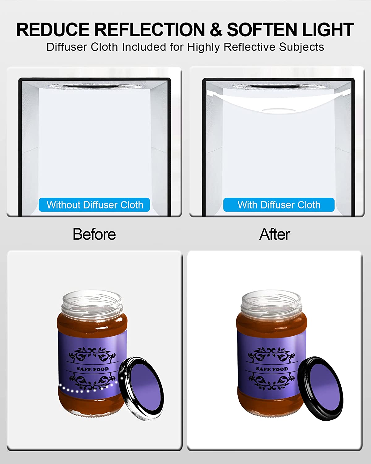 • 【Portable and Foldable】Portable folding structure design, more convenient to install and carry, built-in led light, providing average light and prevents shadows and reflections in your photos.