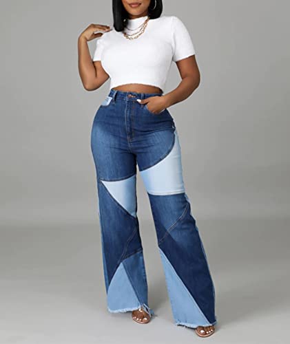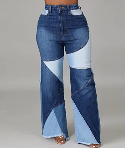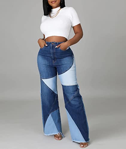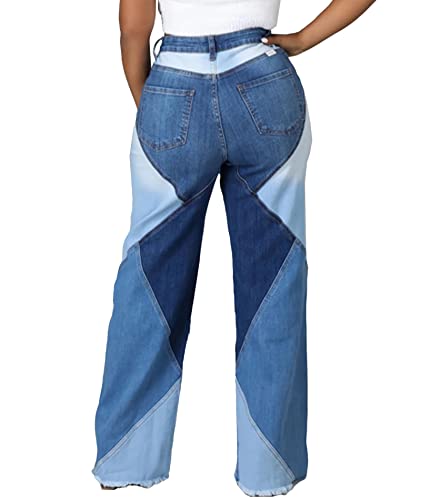 Sexyshine Women's High Waist Patchwork Baggy Jeans Chic Straight Wide Leg Raw Hem Cut Bottom Denim Pants(23704BE,XS)