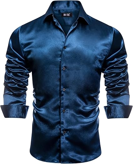 Hi-Tie Designer Men's Navy Blue Dress Shirt Satin Silk Like Long Sleeve Regular Fit Turn Down Collar Casual Shirt for Formal Prom(Large)