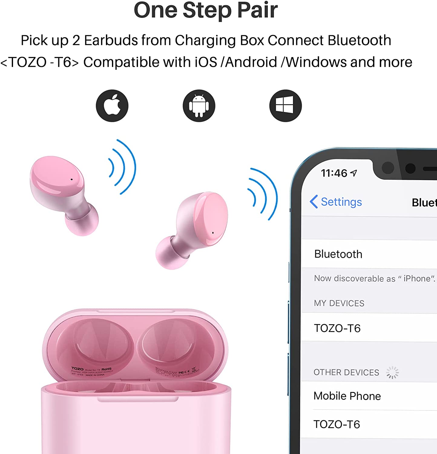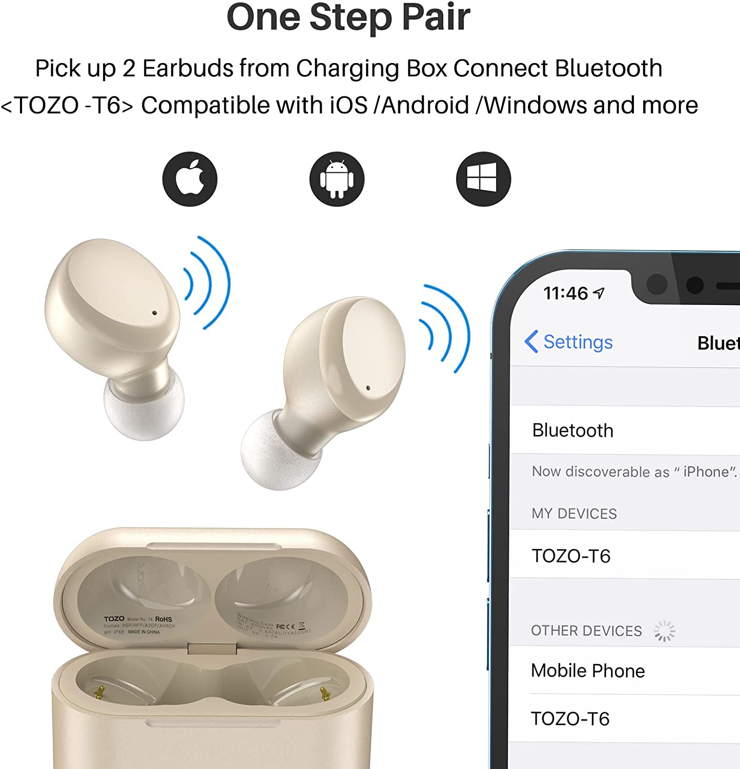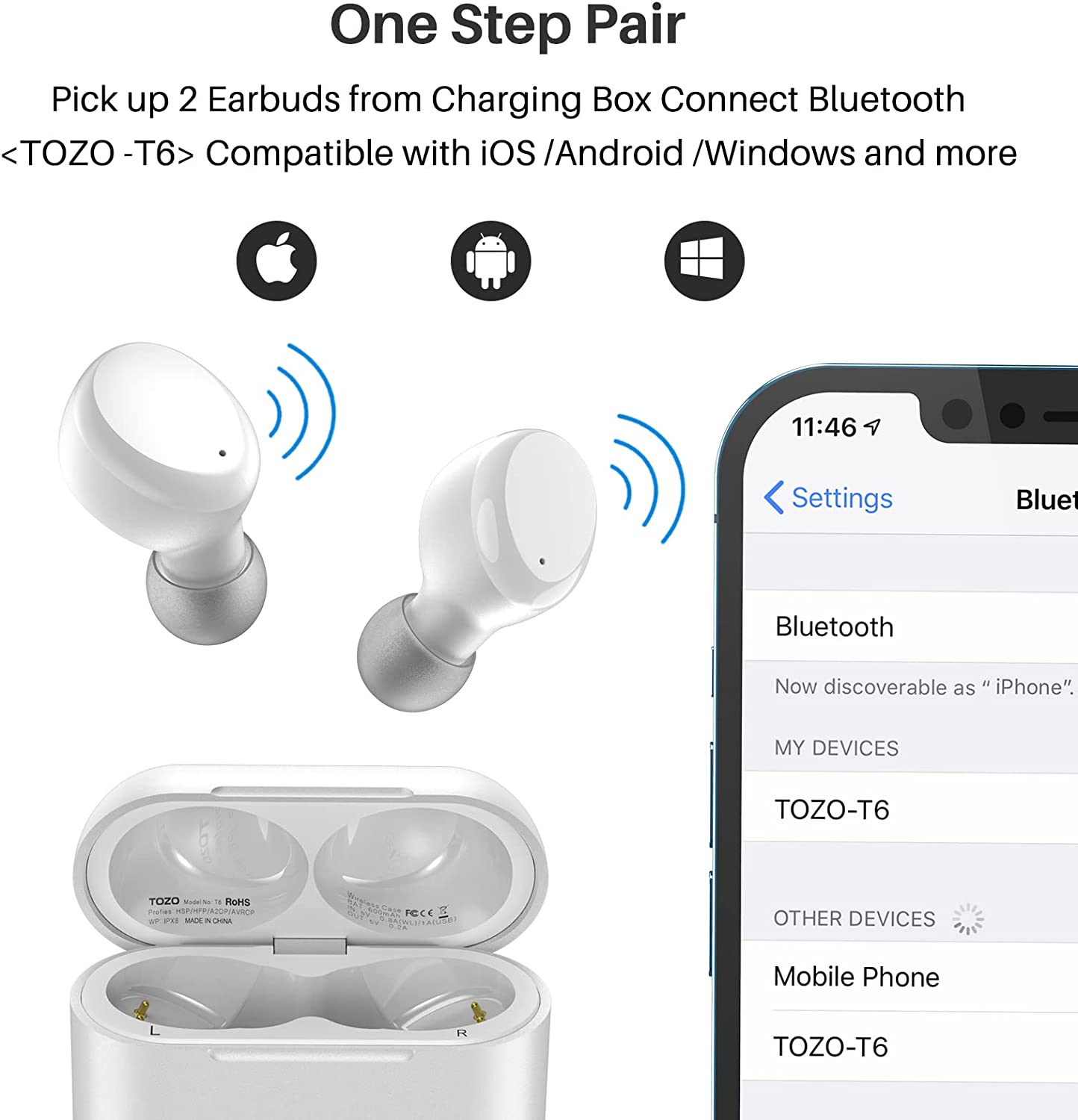 • [One Step Pairing] Pick up 2 headsets from charging case and they will connect each other automatically, then only one step easily enter mobile phone Bluetooth setting to pair the earbuds.