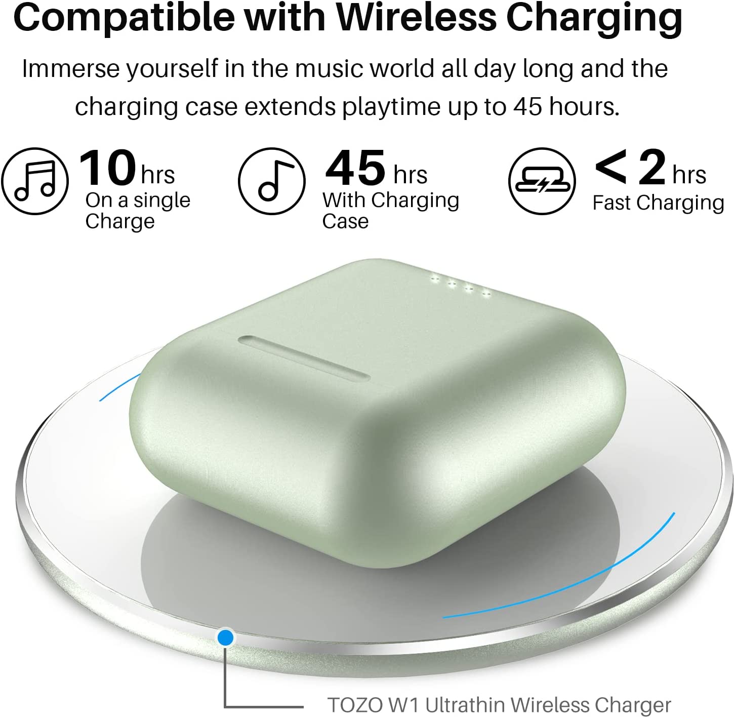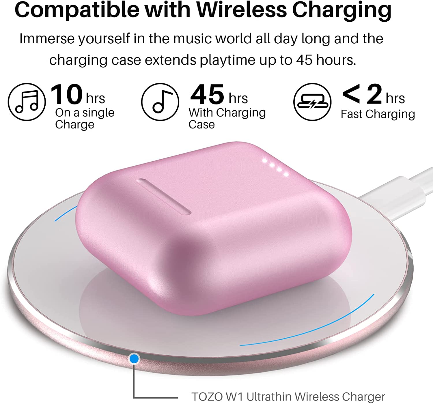 • [Charge on the Go] Playtime lasts for over 10 hours from single charge and total 45 hours with charging case. Enjoy fast charging, to fully charge the rechargerable case only 55 minutes via cable or less than 2 hours via wireless charger. Providing convenient charging way with no strings attached.