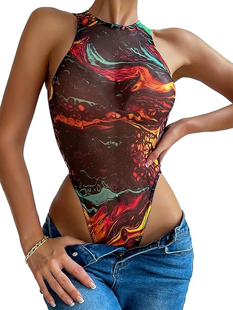 Women Rave Outfit Sexy Mesh Teddy Lingerie Bodysuit Tie Dye Mock Neck Sleeveless Body Suit Tops