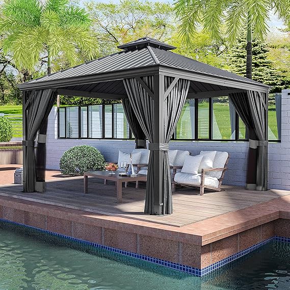 HAPPATIO 12' x 12' Hardtop Gazebo, Outdoor Aluminum Gazebo with Galvanized Steel, Double Roof Permanent Patio Metal Gazebo Canopy with Netting and Curtains for Garden, Patio, Lawns, Parties (Grey)