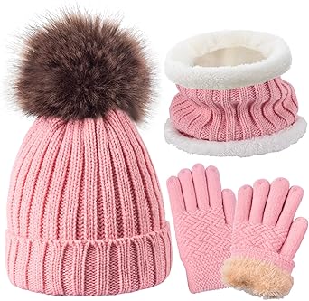 Kids Winter Knit Beanie Hat Scarf and Gloves Set for Girls Boys with Pompom