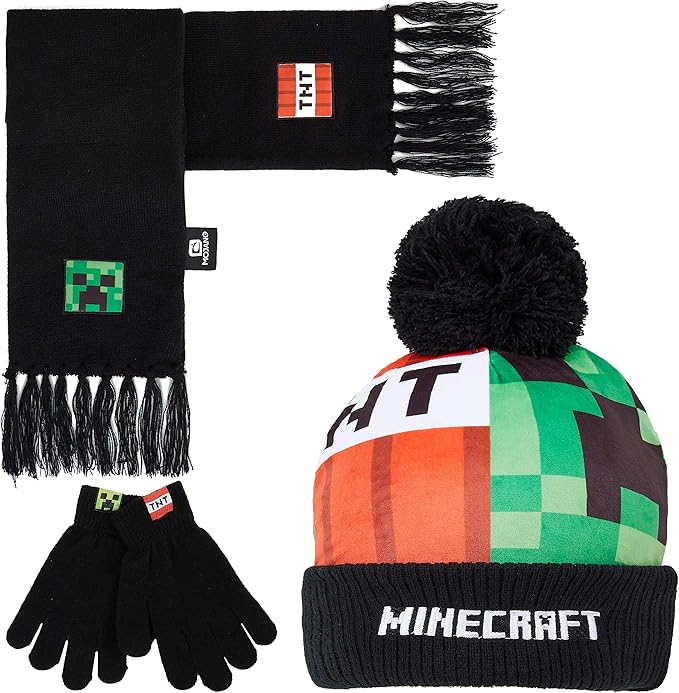 Minecraft Boys Beanie Hat Gloves And Scarf Set, Winter Accessory Set - Boys Gift