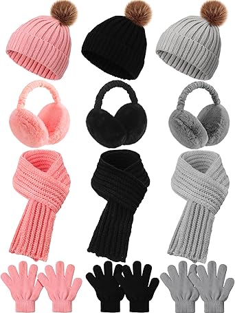 Suhine 12 Pcs Winter Soft Kid Hat Scarf Gloves Earmuffs Set Knit Hat and Gloves Neck Warmer Plush Ear Muffs for Kid Aged 3-10