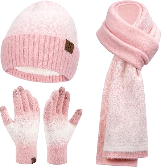 Womens Winter Knit Beanie Hats and Touchscreen Gloves Long Scarf Set with Warm Fleece Lined Skull Caps Scarves for Women