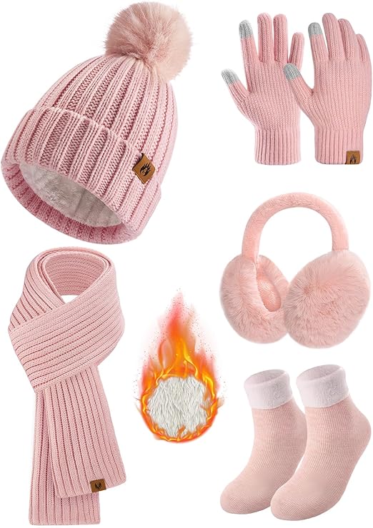 Yusongirl Winter Women Scarf Gloves Beanie Ear Muffs Socks Set Cold Weather Warm Knit Hat Fleece Long Neck Warmer 5 in 1 Set