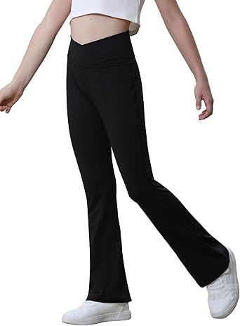 Girls Flare Leggings Black Pink Crossover High Waisted Workout Running Dance Bootleg Yoga Pants
