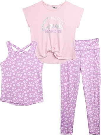 RBX Girls' Activewear Set - 3 Piece Short Sleeve Performance T-Shirt, Tank Top, and Capri Leggings (Size: 7-12)