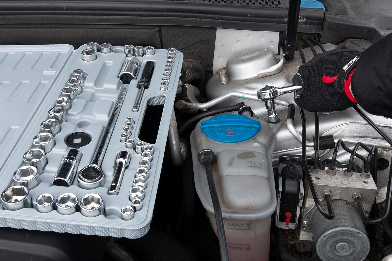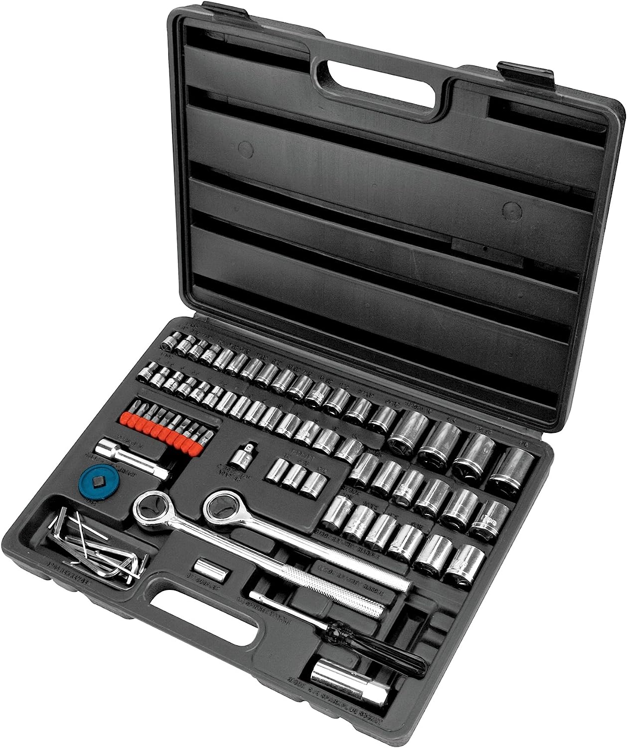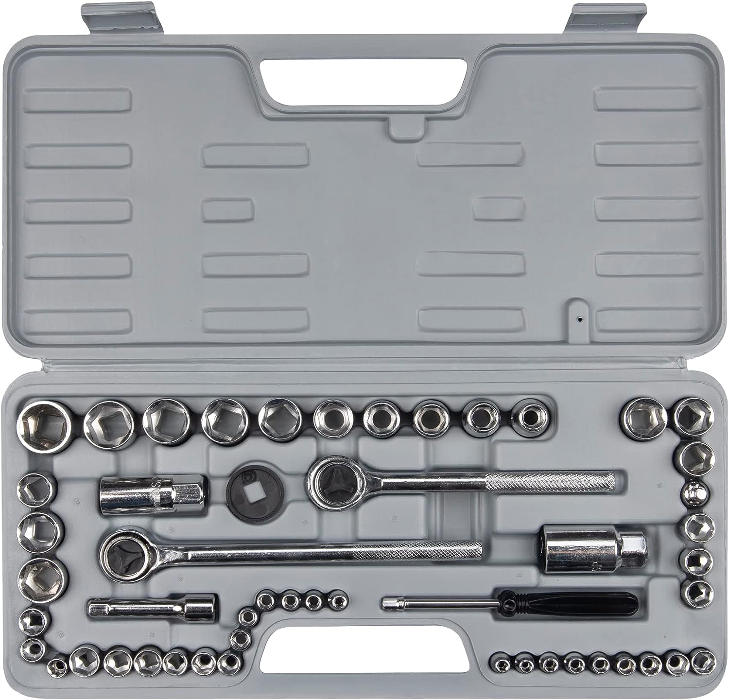 • 45 PIECE TOOL SIZES: Ratchet, extension bar, 1/4" spinner handle, spark plug socket, adapter and more