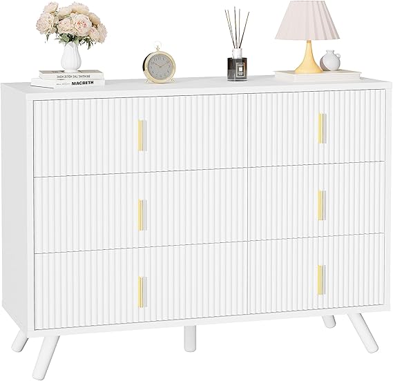 BEWISHOME White Dresser for Bedroom, 6 Drawer Dresser Chests of Drawers with Waveform Fluted Panel, White and Gold Dresser, Modern Wide Dresser Wood dresser for Closet, TV Stand, Hallway, White KCG03W