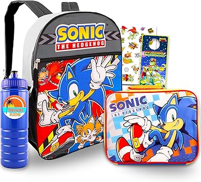 Nintendo Sonic the Hedgehog Backpack with Lunch Box Set - Bundle with 16_ѝ Sonic Backpack, Sonic Lunch Box, Water Bottle, Stickers, More | Sonic Backpack for Boys