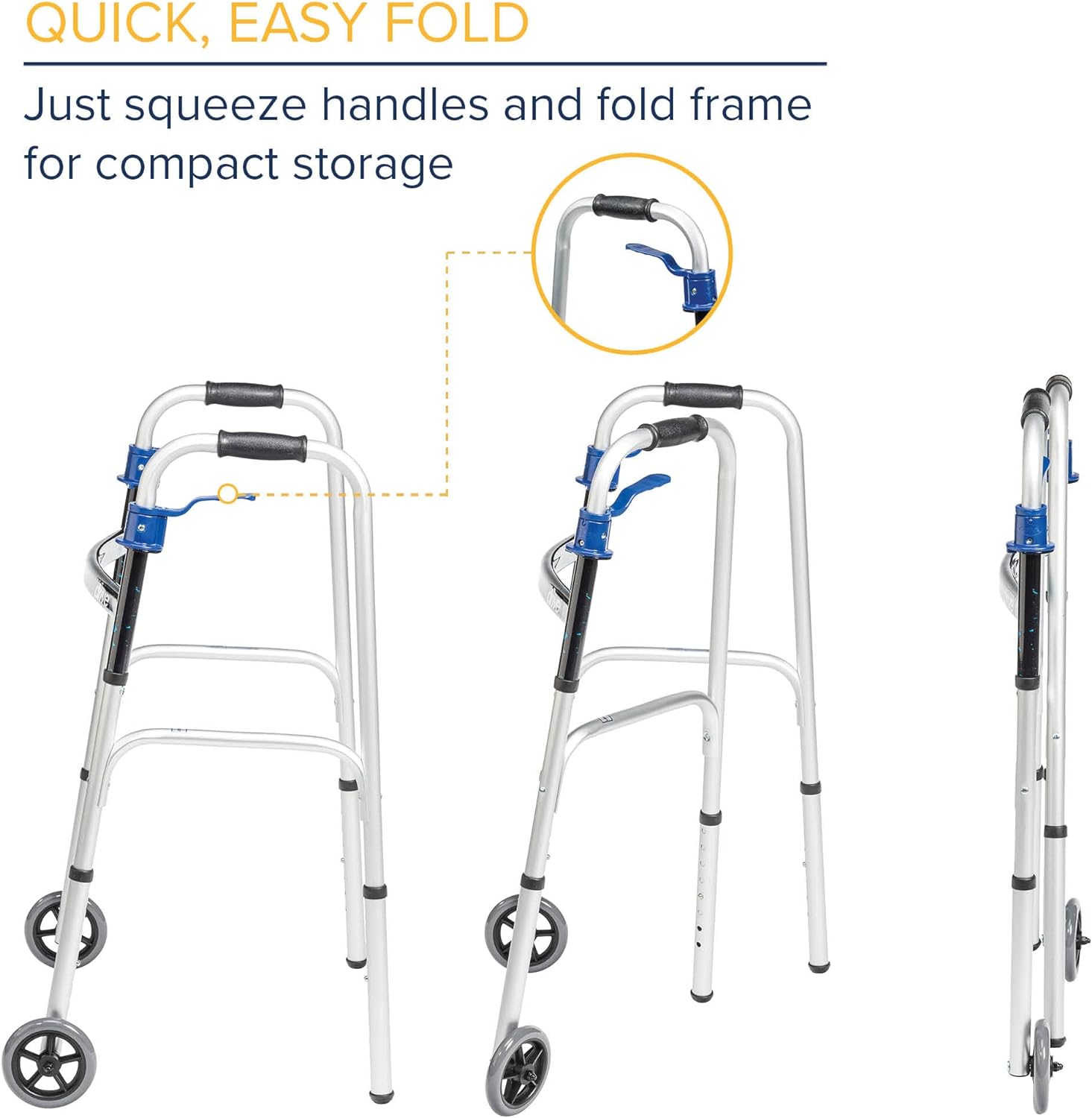• Premium Features: Our rolling walker features 5-inch wheels; a ribbed, contoured hand grip; and newly designed rear glide caps that allow the wheeled walker to slide smoothly over most surfaces